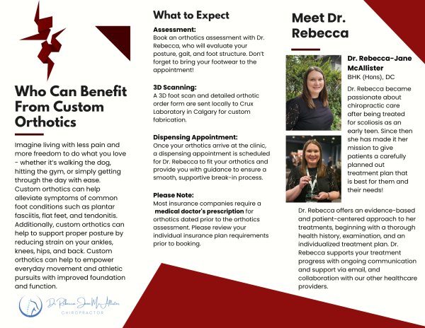 Step 1: Book an orthotics assessment with Dr. Rebecca, who will evaluate your posture, gait, and foot structure.… Don’t forget to bring your footwear to the appointment!